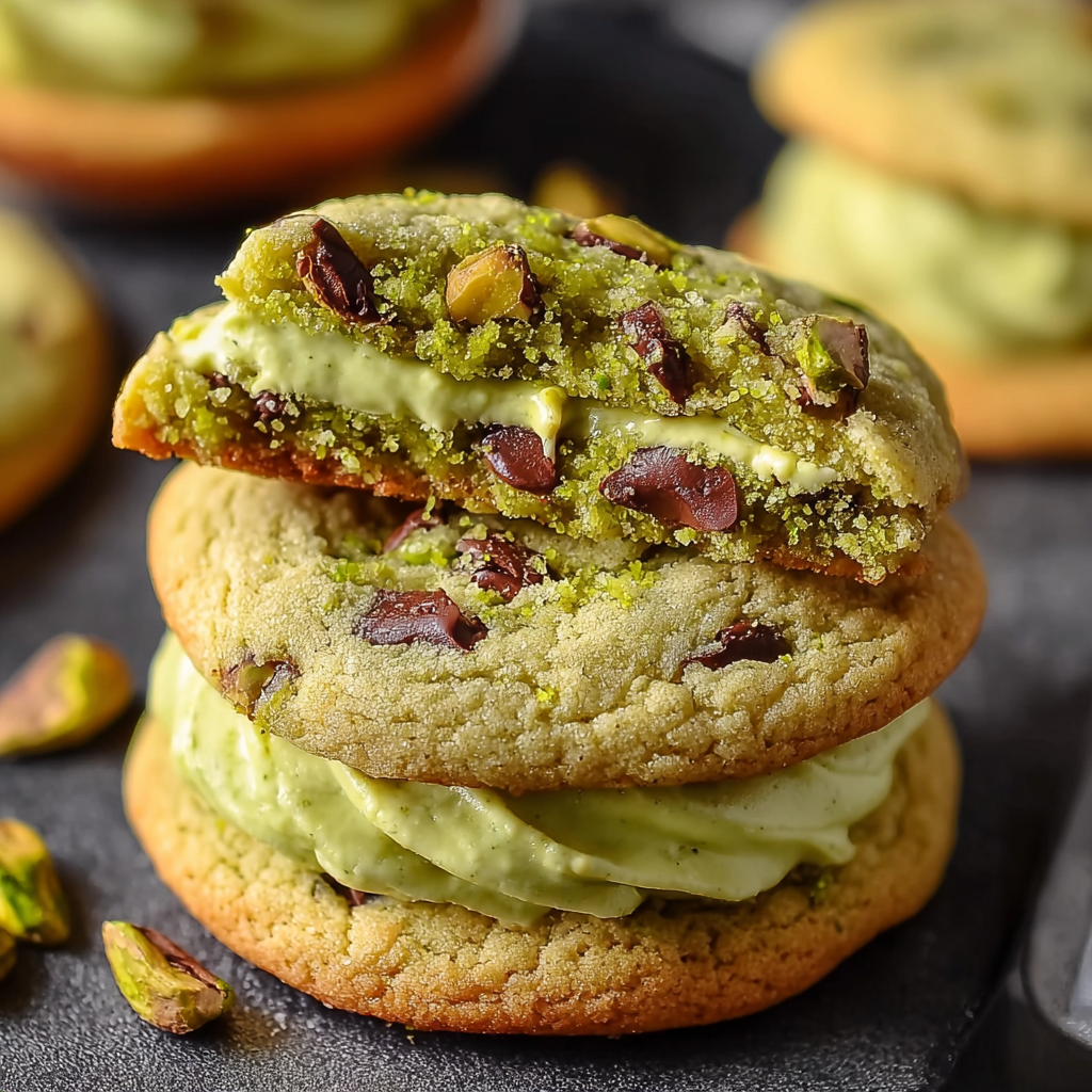 Pistachio Cream Cookies are delicious treats filled with creamy pistachio spread, offering a unique flavor paired with chocolate chips.